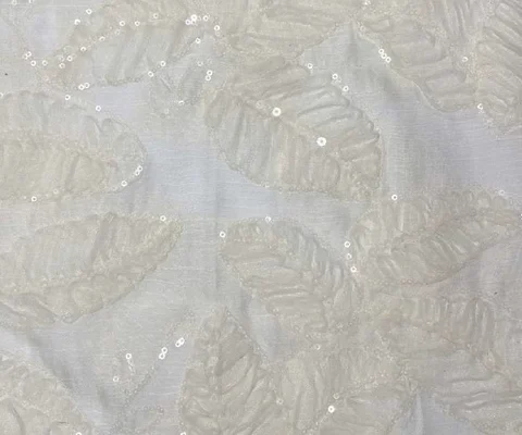 Base ligera y translúcida intervenida con bordado de hojas en relieve, realzadas con delicadas lentejuelas que aportan luminosidad y sofisticación. Ideal para vestidos de fiesta, blusas, faldas, alta costura y decoración elegante. Disponible en color crudo y negro