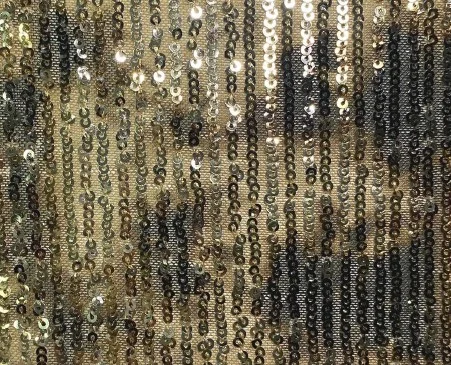 Una tela sofisticada y llamativa, ideal para confecciones que buscan impacto visual y elegancia. Sus lentejuelas en tonos dorados y negros generan un efecto brillante y dinámico con cada movimiento, perfecto para vestidos de fiesta, tops, faldas, escenografía, decoración y accesorios.